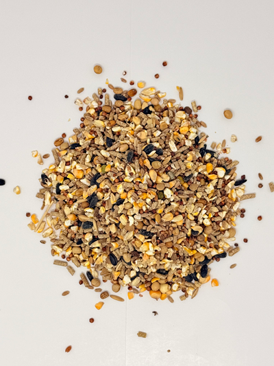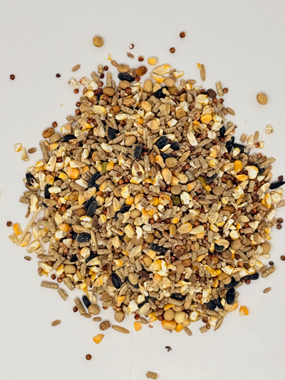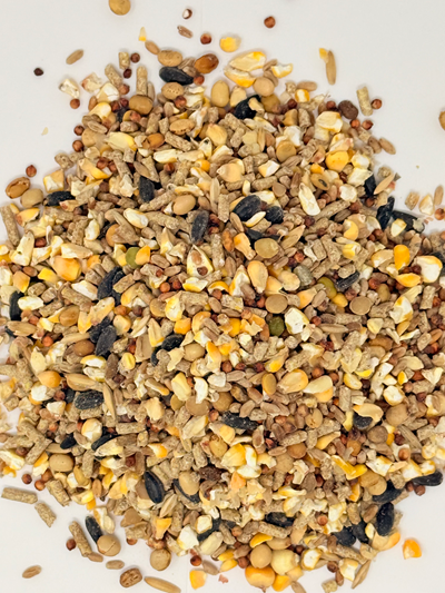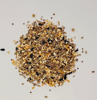 CRACKED CORN, SORGHUM, WHEAT, BLACK OIL SUNFLOWER, PELLETS, GREEN PEAS, ROASTED SOY